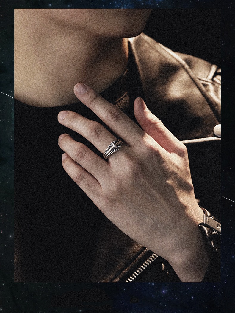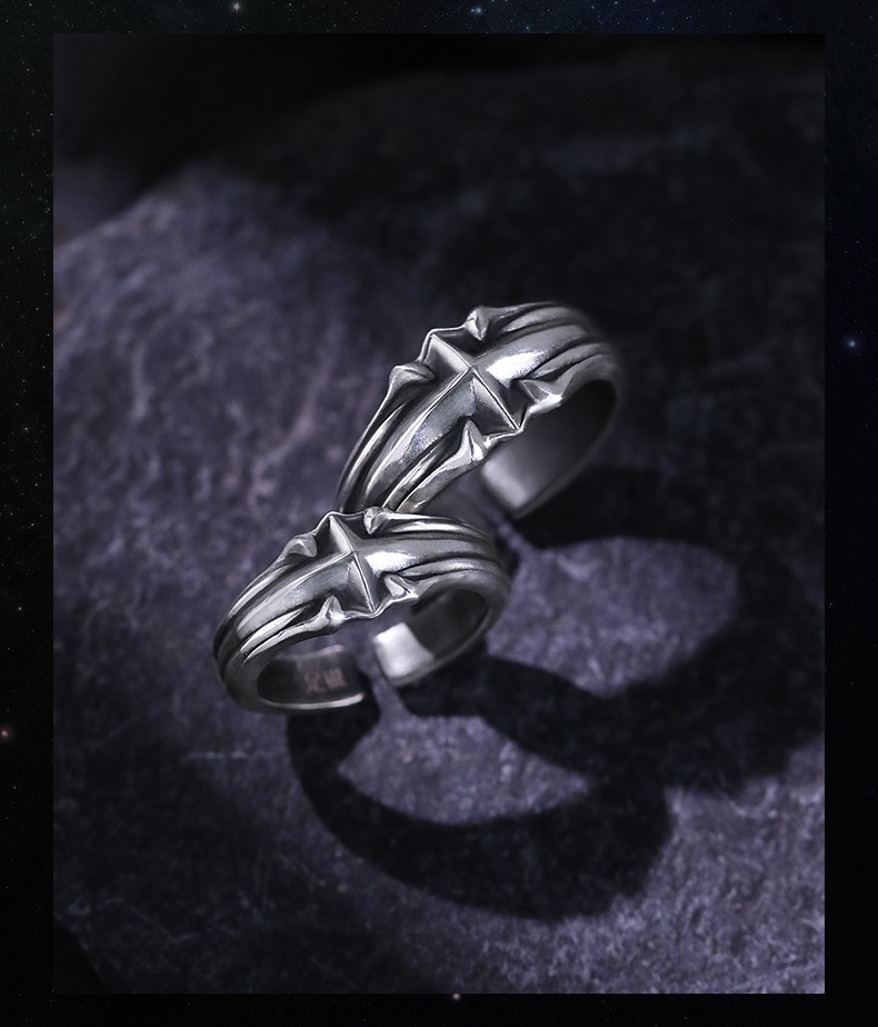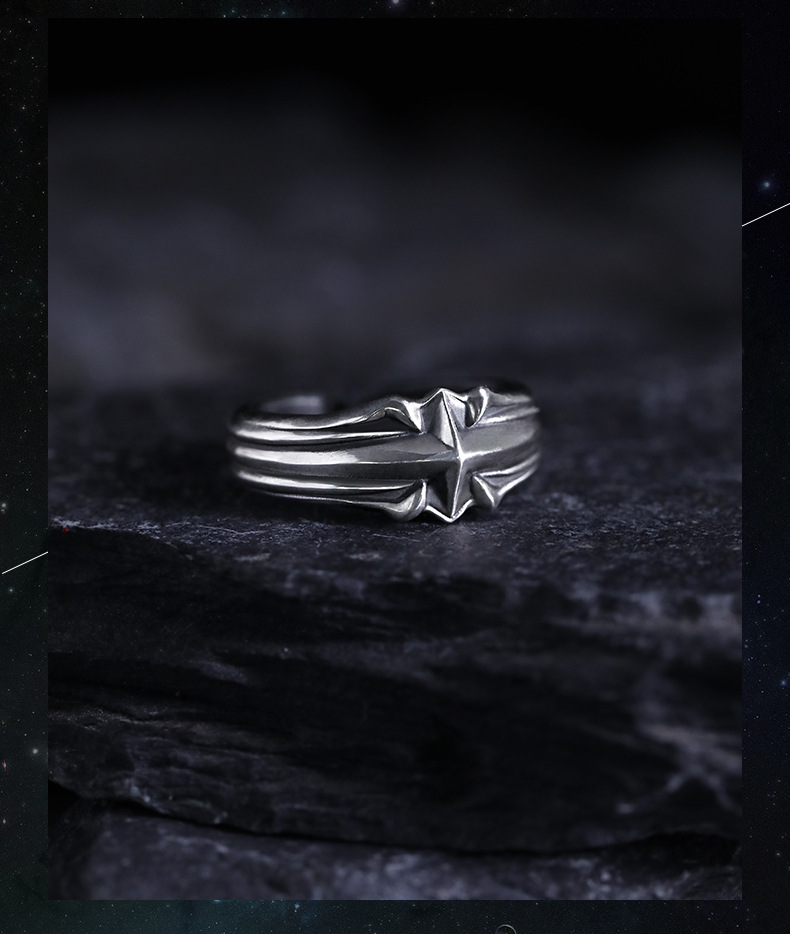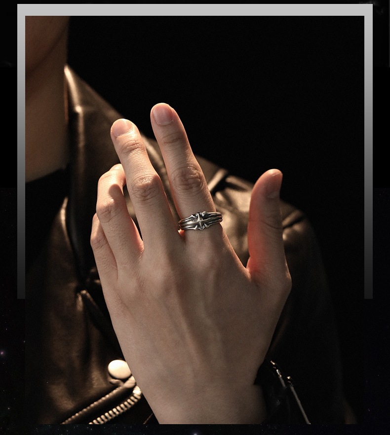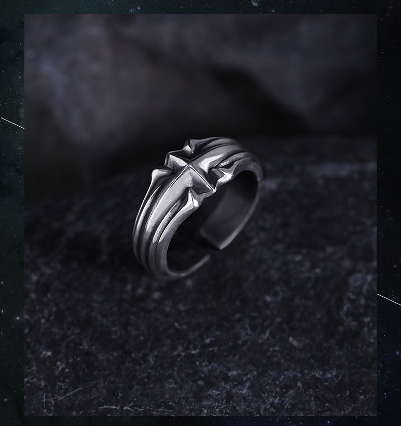 The Noctis Ring – an elegant unisex jewelry piece crafted from high-quality cooperative silver with a refined electroplated finish. Minimalist in design yet featuring a subtle cross motif on the top, it adds a mysterious, dark touch to your look. Thanks to its adjustable open design, it fits comfortably on any finger.